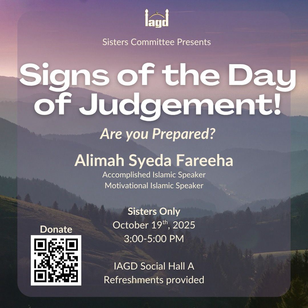 8:00 AM - 5:00 PM Signs of the Day of Judgement | Alimah Syed Fareeha October 12 @ 8:00 AM - 5:00 PM Signs of the Day of Judgement | Alimah Syed Fareeha RSVP Now Free
