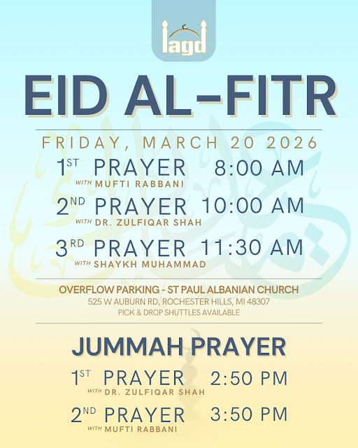 Join us for Eid al-Fitr prayers at IAGD! Three prayer times available to accommodate everyone. Please plan accordingly and take note of overflow parking and shuttle services. May Allah (SWT) accept from all of us.