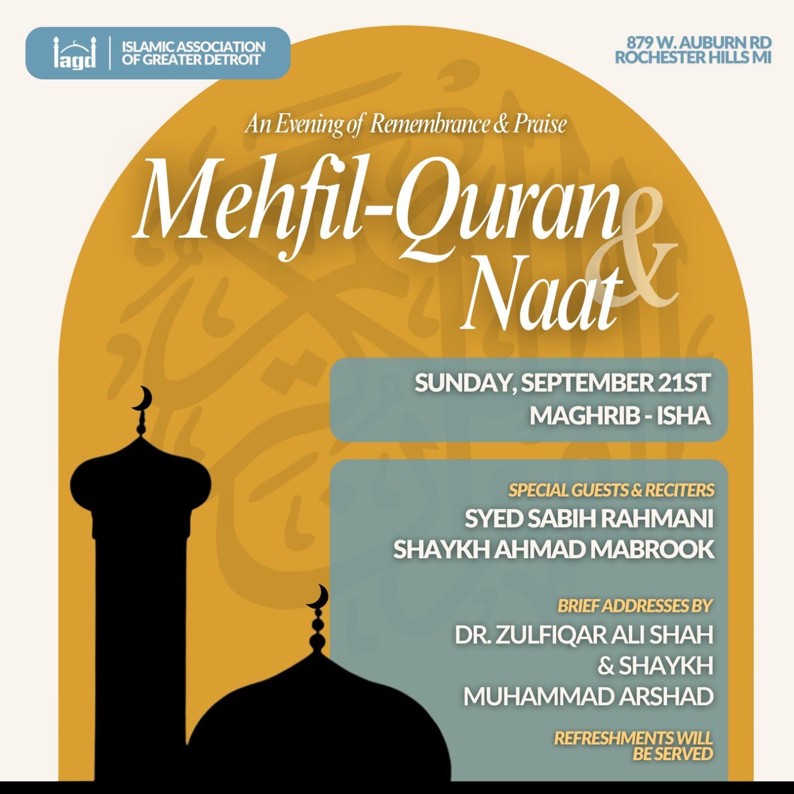 « All Events IAGD Seerah Conference Date & Time: September 6, 2025 @ 5:30 PM - 10:30 PM EDT Free Venue IAGD 879 Auburn Rd Rochester Hills, MI 48307 United States + Google Map (248) 852-5657 View Venue Website Add to calendar Google Calendar iCalendar Outlook 365 Outlook Live